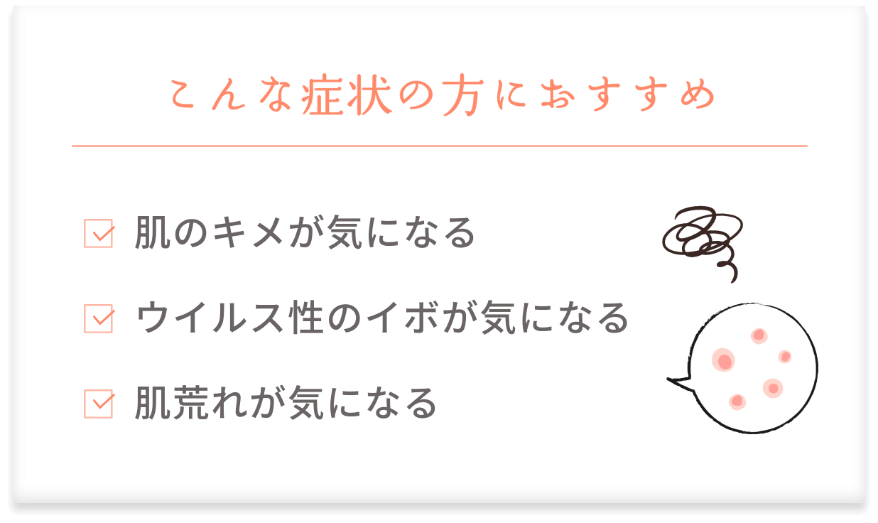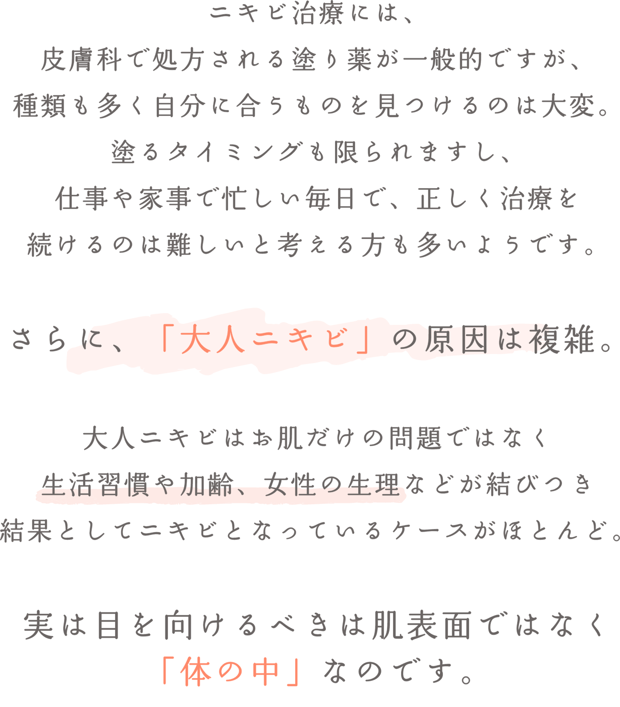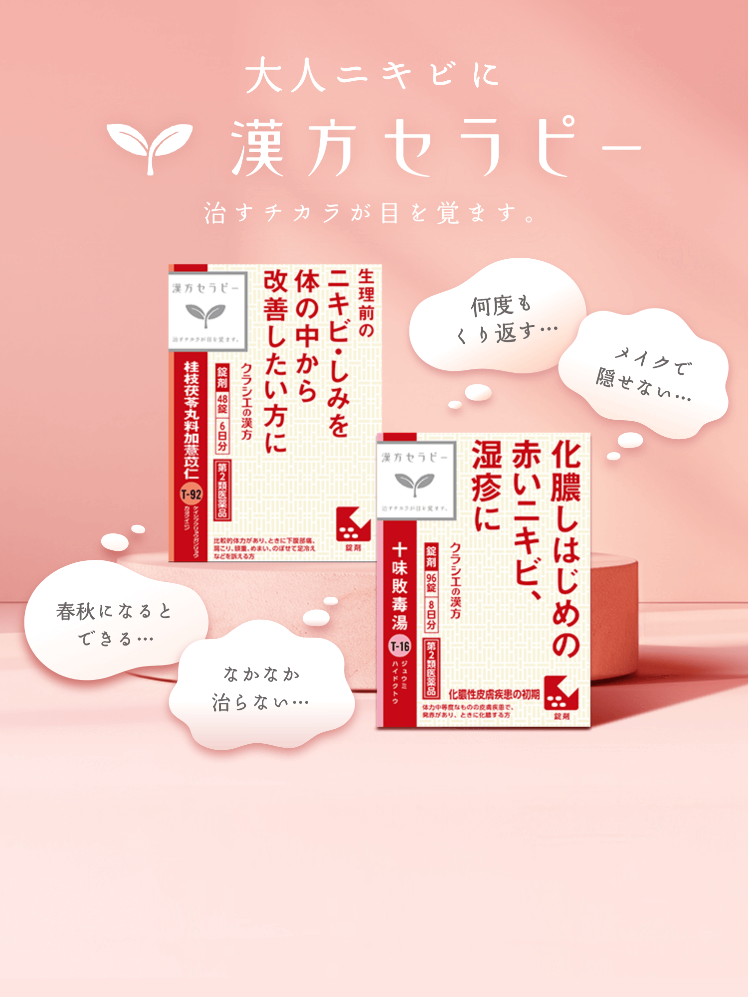 「皮膚は内蔵の鏡」と考える漢方では、肌だけではなく体の中を整えることを大切にしています。漢方はご自身のニキビができやすい体質にも改善するように働きます。また、改善目標のニキビ症状だけでなく、効能に記載している不調の緩和を期待できるのです。