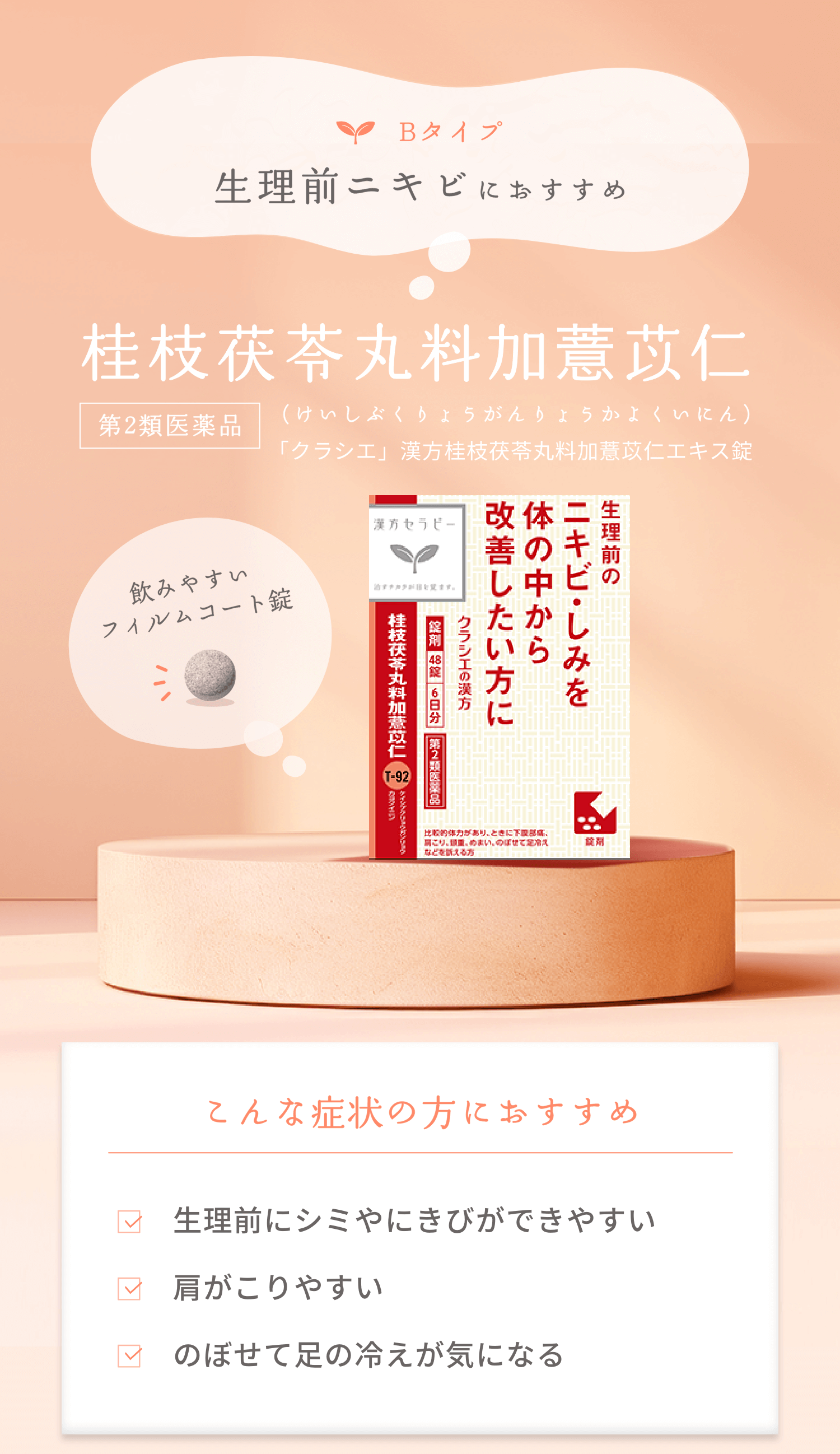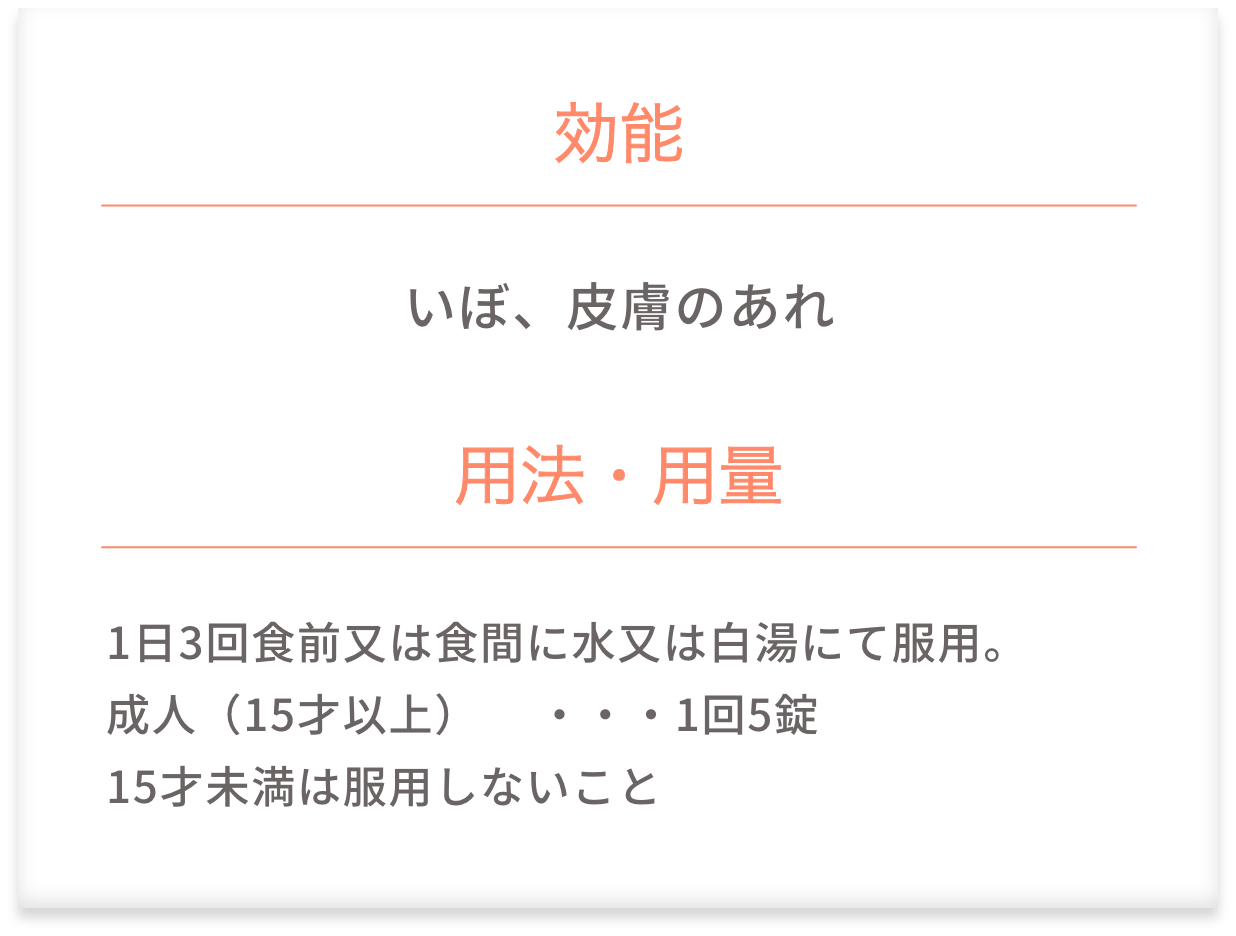 比較的体力があり、ときに下腹部痛、肩こり、頭重、めまい、のぼせて足冷えなどを訴えるものの次の諸症:にきび、しみ、手足のあれ(手足の湿疹・皮膚炎)、月経不順、血の道症