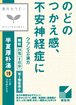 体力中等度をめやすとして、気分がふさいで、咽喉・食道部に異物感があり、ときに動悸、めまい、嘔気などを伴う次の諸症:不安神経症、神経性胃炎、つわり、せき、しわがれ声、のどのつかえ感