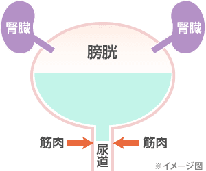 膀胱に尿がたまっても、尿道を筋肉が締めつけているので、すぐに出てしまうことはありません。トイレに行くなどして、脳が「尿を出してもいいですよ」という命令を出すと、この筋肉がゆるんで尿道が開き、止められていた尿が排泄されます。