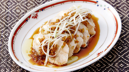 - 器に長ねぎ、しそ、(1)の鶏肉をスライスして盛りつけ、醤油・酢にねぎを和えたタレをかけます。