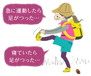 こむらがえりの“こむら(腓)”とは、ふくらはぎのことで、急激なけいれんによる強い痛みが生じるのが特長です。原因はいろいろ考えられますが、