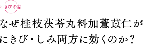 桂枝茯苓丸料加薏苡仁は、生薬の組み合わせにより、この「血(けつ)」のめぐりを良くするはたらきがあります。血のめぐりが良くなると、ホルモンバランスが整い、にきび(ニキビ)が改善されます。また肌に栄養素をいきわたらせ、皮膚のターンオーバーを正常化させることで、しみ(シミ)や手足のあれなどの肌のお悩みを体の中から改善します。そのほか、月経不順、月経に伴う精神状態の安定などにもおすすめできる処方です