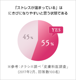 皮膚科医師100人にアンケートをとったところ、その半数以上が「ストレスはにきびの原因」と答えました。 ※参考:クラシエ調べ「皮膚科医調査」(2017年2月、回答数100名)