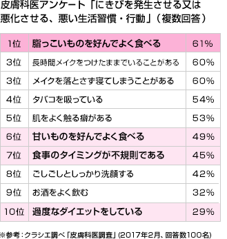 にきびができる原因や悪化させているものは?と、皮膚科医師100人に聞いたところ、