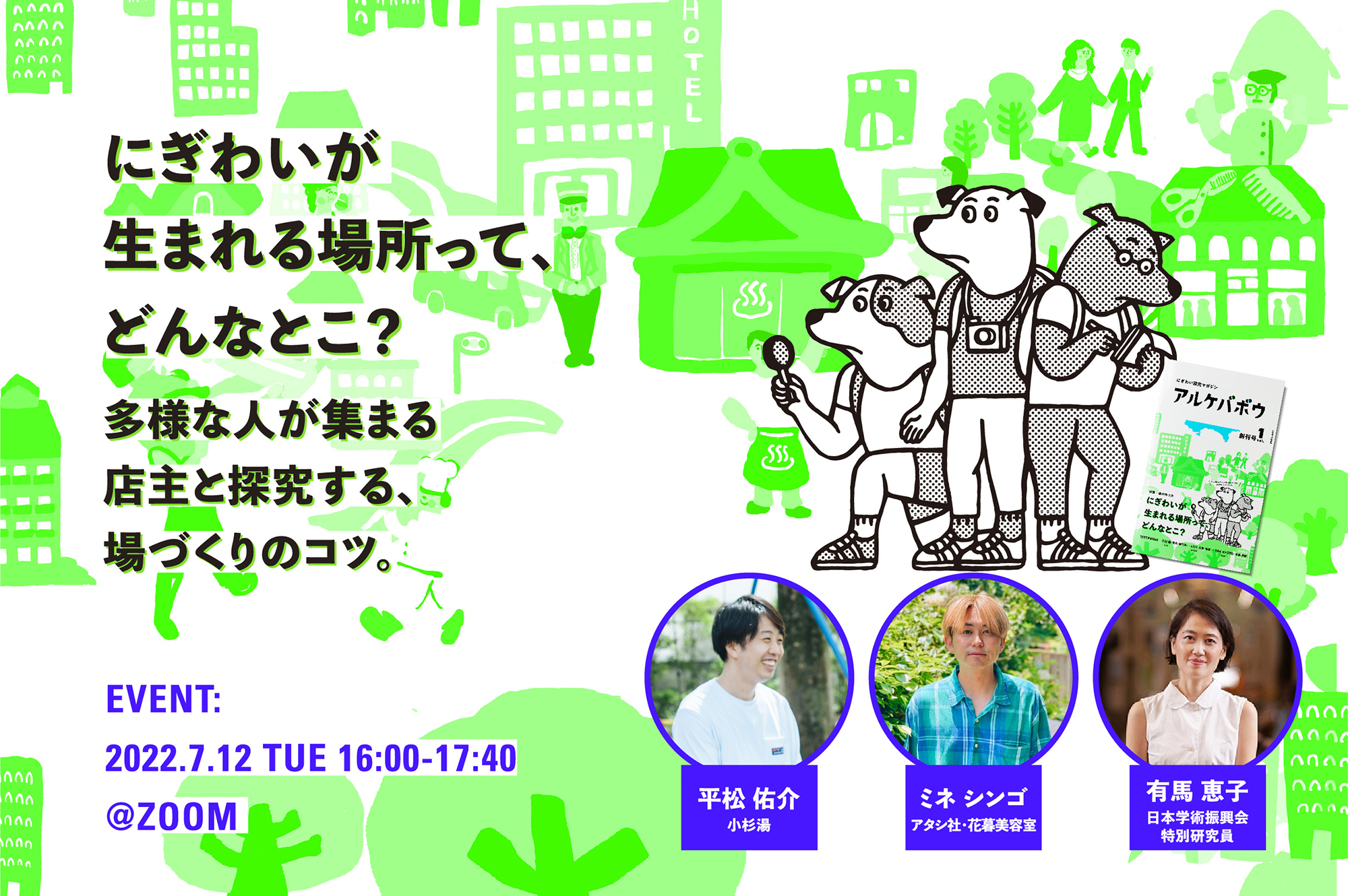 この「アルケバボウ」の創刊を記念して、東京・高円寺にある銭湯「小杉湯」店主の平松佑介さんと、神奈川・三崎の「花暮美容室」をプロデュースする元美容師で編集者のミネシンゴさんをお迎えして、視聴者の皆様とともににぎわいを探究するオンラインイベント「にぎわいが生まれる場所って、どんなとこ?」を開催。(詳細はこちら)