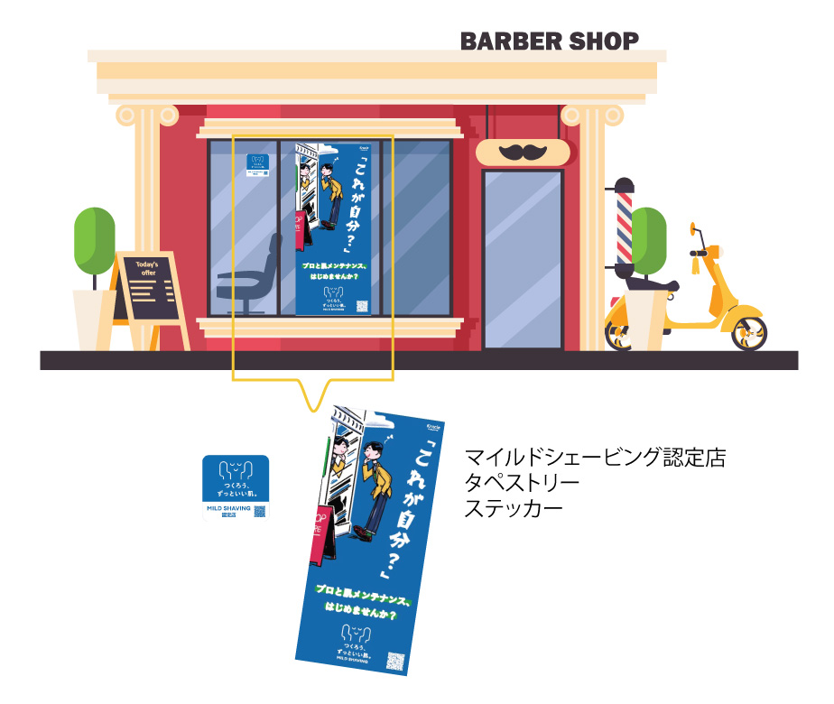 「マイルドシェービング」は、理容師が当社の規定講習を受け、実技テストに合格した“認定サロン”で提供されるメニューです。マイルドシェービング認定サロンは、タペストリーやステッカーが目印です。