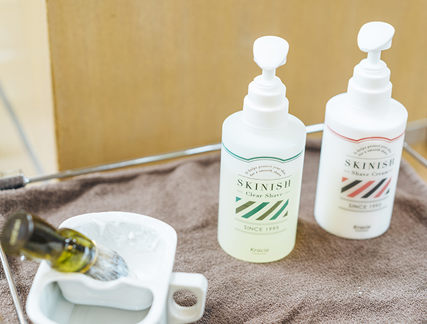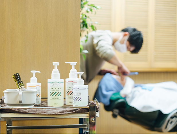 「気持ちがよくて思わず眠ってしまった」「自分で剃るのとは全然違う」「肌がツルツルに」そんな声を、もっと聞きたいから。「SKINISH(スキニッシュ)」は、“理容師のシェービング技術が活きる”弱酸性シェービングシリーズ。お客さまの肌をシェービングしやすい状態にすることで、お客さまの肌への負担を軽減するとともに、技術者の剃りやすさもサポート。さらに、保湿効果の高いユズセラミドEX(※1)と6種類の西洋ハーブエキス(※2)が肌をしっかりと潤して整え、ワンランク上の心地よい剃り上がりへ。香りは、リラックスできる時間を演出する爽やかなマイルドシトラス。すべては、お客さまとプロにとって、快適なシェービングのために。