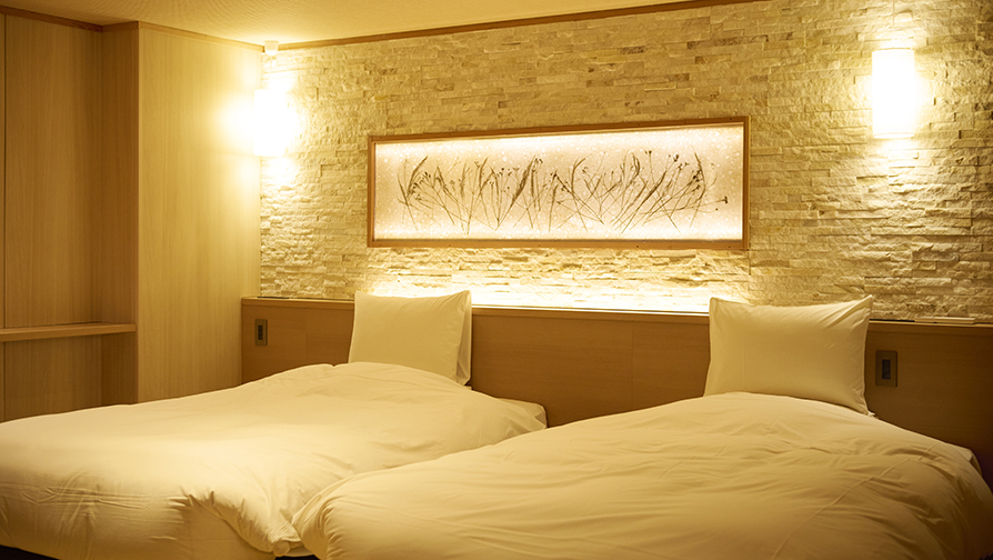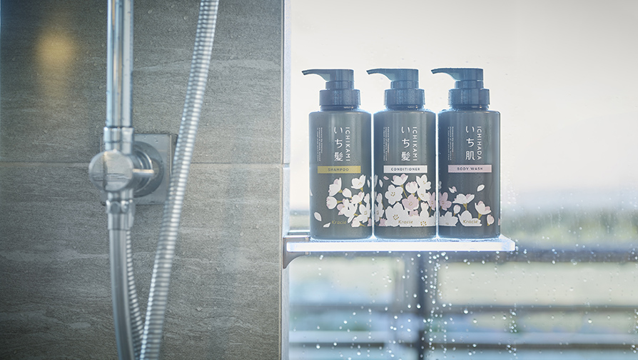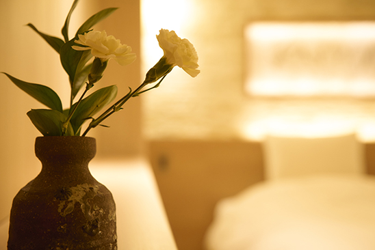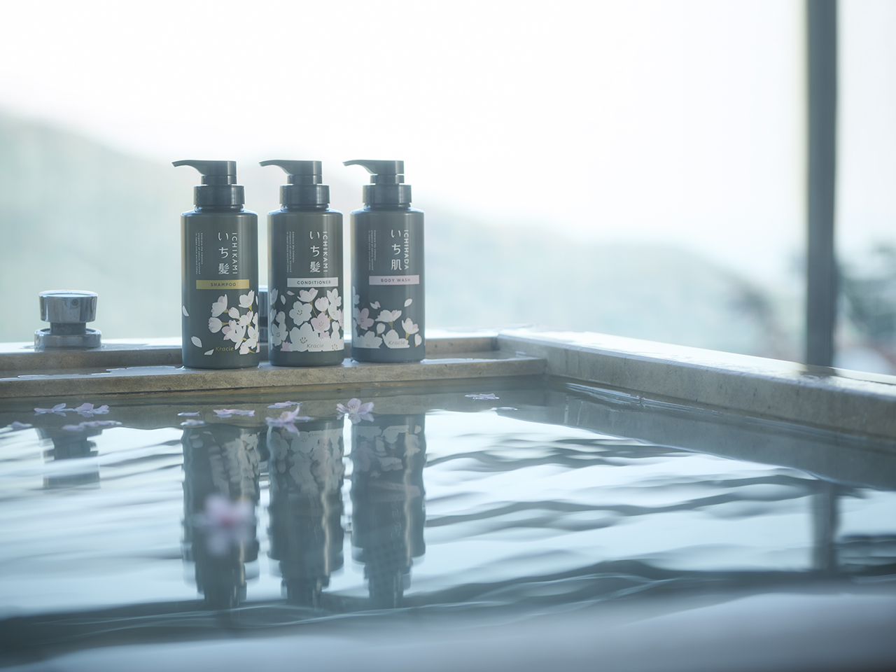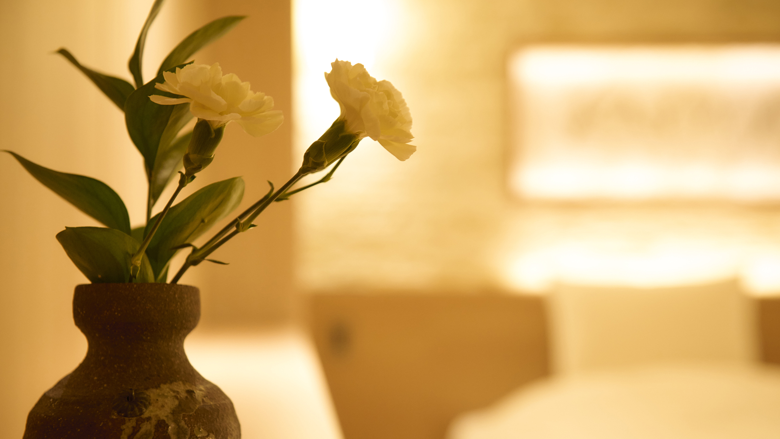 心地よく設えたベッドルームに、さりげなく添えた一輪の花。肌あたりのやわらかなお湯と、まるで「桜が花開く瞬間」のようなシャンプーの香り。そして、ほどよい距離感でそっと支えるおもてなし。大自然に囲まれた宿で、疲れた心と体を癒し、静かに自分と向き合うひとときが、その人だけの美しさを育んでいく。