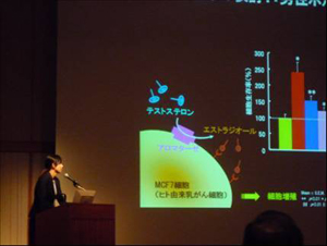 そこで、漢方研究所では精巣摘出マウス(男性ホルモン低下状態)を用いてその血中テストステロン(T)および性器官重量(精嚢と前立腺)に対するこの処方の作用を検討しました。さらにTをエストロゲンに変換する性ホルモン生合成系の最終段階を担う律速酵素であるアロマターゼに対する該処方およびその構成生薬の阻害作用をin vitro実験系にて検討し、その作用メカニズムの解明を試みました。