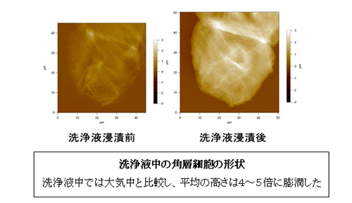 洗浄液中の角層細胞の形状を測定したところ、角層細胞内に洗浄液が浸透し、急激に膨潤することが確認されました。