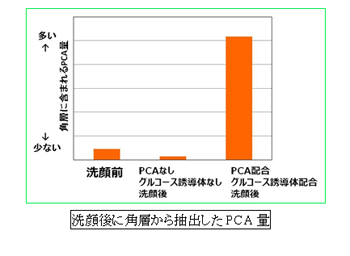 角層細胞内に存在する保湿因子の1つである「PCA」は、水に解けやすい性質のため洗顔中に流出し、角層水分量の低下を引き起こす要因の1つであることが、これまでの当社の研究から分かっていました。