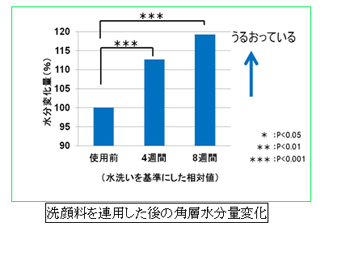 実際に洗顔後の角層水分量を測定すると、洗顔直後から急激に水分量が低下し、10分後には最低値を示し、その後、回復するものの120分後でも洗顔前の水分量に戻らないことが分かりました。そこで洗浄後の角層水分量の低下に着目し、研究に着手しました。