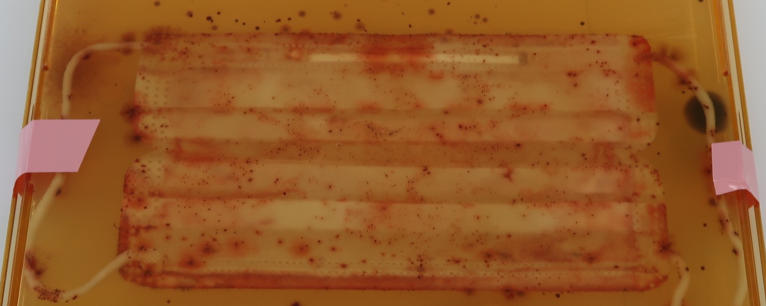 1日中つけていたマスクは、いったいどのようなことになっているのでしょうか。ビューティケア研究所では、男女22名を対象に使用したマスクの微生物の状況がどのようになっているかについて調査を実施しました。約8時間使用したマスクに付着している微生物を測定したところ、多い人で1枚当たり106CFUを超える細菌、104CFUを超える真菌が確認されました。(2020年7月実施)
