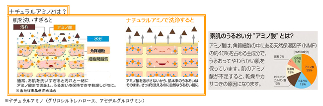 ●「ナチュラルアミノ」(天然由来うるおいケア成分)配合 洗浄時に失われるうるおい分「アミノ酸」の流出を防ぎ、素肌のうるおいを守ります。 |