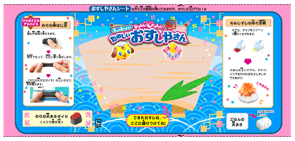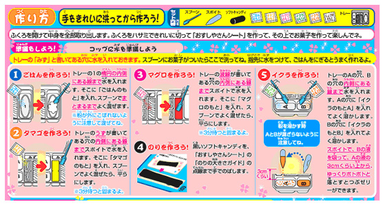 ( 4 ) 出来上がった「おすし」は、トレーや粉の包装紙に描かれている「すし台」に盛り付けてお楽しみください。