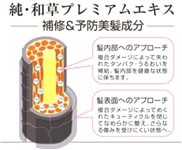 ●「純・和草プレミアムエキス」(補修&予防美髪成分)配合 「コメプレミアムEX-II」(※1)、「サクラエキス」、「黒米エキス」、「ツバキエキス」、「ヒオウギ」など、古来、髪に良いとされている各種和草の成分が含まれています。 ダメージによって失われたうるおいを補給、持続させ、ダメージを補修。パサつく髪をしなやかにまとめ、傷みにくい髪へと導きます。 ※1:イノシトール(予防美髪成分)を含む米の研ぎ汁由来成分