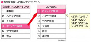 また、ストレスを感じる女性が増加する中で、幅広い年代の女性が“香りアイテム”で心と体を癒す傾向にあり、特に20代ではボディ関連アイテムの購入時に、香りは重要なポイントになっています。 |