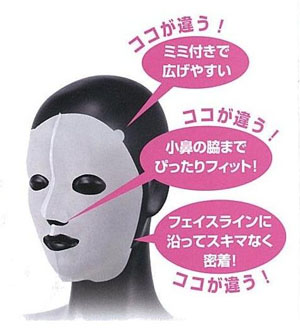 <密着性>立体成型で密着性が高く、顔全体を隙間なく、すっぽり包み、小鼻の脇やフェイスラインもぴったりフィットするため、美容成分が角質層の深層までぐんぐん浸透します。