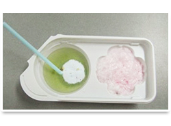 1) 水と粉を混ぜ合わせた液体に、折り曲げたストローを浸し、この上に「グミのもと(粉末)」を振りかけ釣り上げるように
