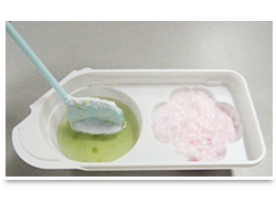 3) 出来上がったグミを小さく切って泡ソースにつけると、おいしさがアップします。
