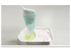 水と粉を混ぜた液体にストローを浸し、このストローの上に粉末の「グミのもと」を振りかけて持ち上げると、あっという間に長いグミが出来あがります。まるでグミを釣り上げたような不思議な楽しさが体感できます。出来たグミは、小さく切ってふわふわの泡ソースにつけて食べると、さらにおいしくなります。
