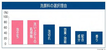 当社調査では、多くの女性が「洗う」という基本機能だけでは満足せず、洗顔に「洗い上がりの肌感触」(85%)など、スキンケア効果を求めているという結果が出ています。ほかに、洗顔料購入時の選択理由として、「泡立ち」(85%)もニーズが高くなっています。 |