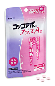 「コッコアポプラスA錠」は、1982年発売のロングセラー「コッコアポ」シリーズの新商品として発売いたします。「防風通聖散」という18種類の生薬からなる漢方薬で、脂質の代謝を促し、余分な腹部の脂肪を減らします。また、腹部の脂肪が多い方で、高血圧や肥満に伴う便秘の改善にも効果があります。
