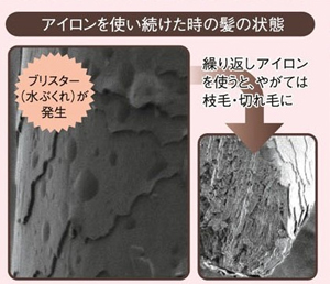 アイロン・コテの温度は180℃~200℃にもなる高温です。それを直接、髪にあてると、キューティクルが水ぶくれの状態になる“髪ヤケド”を引き起こしたり、髪色が変色してしまったりします。さらに、それを繰り返すことで、枝毛・切れ毛などの深刻なダメージとなります。 |