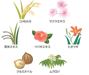 米の研ぎ汁由来成分をはじめ、「黒米エキス」、「サクラエキス」など古来、髪に良いとされてきた各種和草の成分を配合。新たに「あんず油」、「茶花エキス」を加えました。