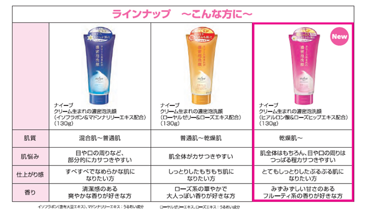 クラシエホームプロダクツは、「保湿クリーム成分」を高配合した「ナイーブ クリーム生まれの濃密泡洗顔(ヒアルロン酸&ローズヒップエキス配合)」を8月24日に新発売いたします。すすいだ後も、うるおいを閉じ込めて逃がさない「超しっとりタイプ」の洗顔フォームです。美容液成分「ヒアルロン酸」と植物エキスのうるおい成分「ローズヒップエキス」配合により、上質なうるおいを与えます。ほんのり甘いフルーティフローラルの香りです。