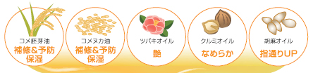 「コメ胚芽油」、「コメヌカ油」、「ツバキオイル」、 「クルミオイル」、「胡麻オイル」の5種類の純度100%天然オイルをブレンドしています。髪の「ダメージ補修」、「ダメージ予防」、「艶」、 「滑らかさ」、「指通り」の機能を兼ね備え、ベタつかず、毛先までしっとりまとまるのが特長です。