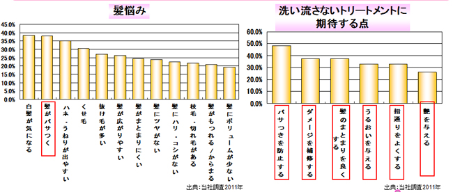 「天然オイル」を含むアウトバストリートメント市場は、前年比99%と微減ですが、高いダメージ補修効果が期待できる「オイル剤型」は前年比103%と伸長しており(2011年)、中でも植物油を使用した「高純度天然オイル」の人気が高くなっています。また、当社調査によると、洗い流さないトリートメントに期待する点として、「パサつき防止」、「ダメージ補修」、「髪のまとまり」などがあげられています。