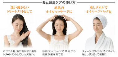 | 1 ) 毎日のケアに、洗い流さないトリートメントとして 2 ) 地肌のオイルマッサージで頭皮ケア 3 ) オイルヘアパックで集中ダメージケア