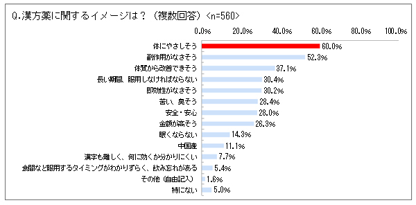 漢方薬に関するイメージは、「体にやさしそう」(60.0%)、「副作用がなさそう」(52.3%)、「体質から改善できそう」