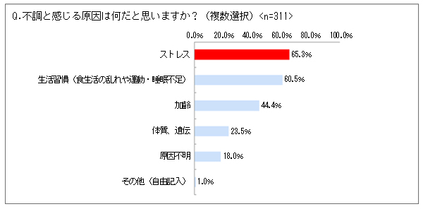 不調の理由は「ストレス」に起因していると考えている方が最も多く(65.3%)、次いで「生活習慣」の乱れ(60.5%)となり
