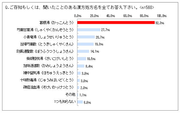 1つも知らないと回答した方は6.6%で、7年前の結果(14.0%)と比較すると、漢方薬が徐々に浸透していることが分かります。