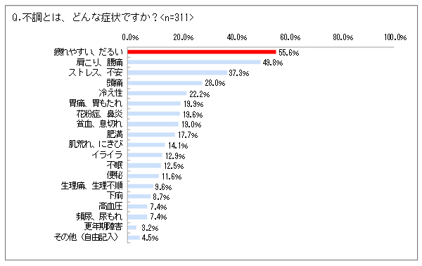 すい、だるい」が最も多く(55.6%)、次いで「肩こり、腰痛」(49.8%)、「ストレス、不安」(37.3%)でした。