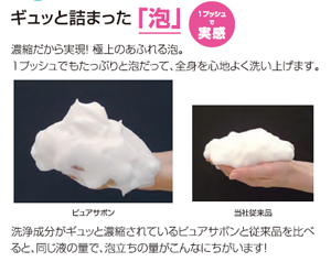 一般的に、ボディソープの洗浄成分は「石鹸」と「合成界面活性剤」に分けられますが、「ピュアサボン」は、石鹸素材を主成分として作られています。洗浄成分の濃度が濃いと固まってしまうため、液状のボディソープを濃縮化するのは困難でした。今回、成分を厳選し、独自の配合技術により、洗浄成分の割合を高めた「濃縮技術」の開発に成功しました。これにより、少しの量でもたっぷり泡立ち、弾力のある密着性に優れた泡を実現しました。