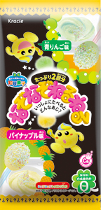2種類の粉にそれぞれ水を入れて練ると、色が変わってふくらみ、「青りんご味」と「パイナップル味」のふわふわなお菓子になります。この2つの味を一緒に食べると夏にピッタリの新たな味に生まれ変ります。3つめの味は何になるかは、食べてからのお楽しみです。
