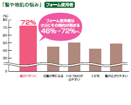 当社調査によると、髪の悩みの1位は「パサつき」(46%)ですが、中でもフォーム状のヘアスタイリング剤使用者は、特に「パサつき」に悩んでいる方が多い(72%)という結果が出ています。