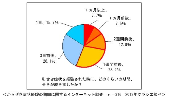「からぜき」とは、乾燥性の痰がからまない「せき」のことです。当社調査によると、過去1年間のせき経験者のうち、約60%の方が「1週間以上に及ぶ『からぜき』を経験している」という結果が出ています。