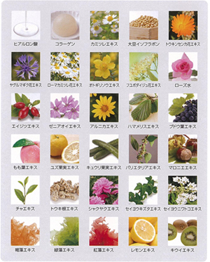 ●30種の厳選した美容エッセンス(保湿成分)を配合 ヒアルロン酸、コラーゲン、カミツレエキス、大豆イソフラボン、トウキンセンカ花エキス、ヤグルマギク花エキス、ローマカミツレ花エキス、オトギリソウエキス、フユボダイジュ花エキス、ローズ水、エイジツエキス、ゼニアオイエキス、アルニカエキス、ハマメリスエキス、ブドウ葉エキス、もも葉エキス、ユズ果実エキス、キュウリ果実エキス、パリエタリアエキス、マロニエエキス、チャエキス、トウキ根エキス、シャクヤクエキス、セイヨウキズタエキス、セイヨウニワトコエキス、褐藻エキス、緑藻エキス、紅藻エキス、レモンエキス、キウイエキス |