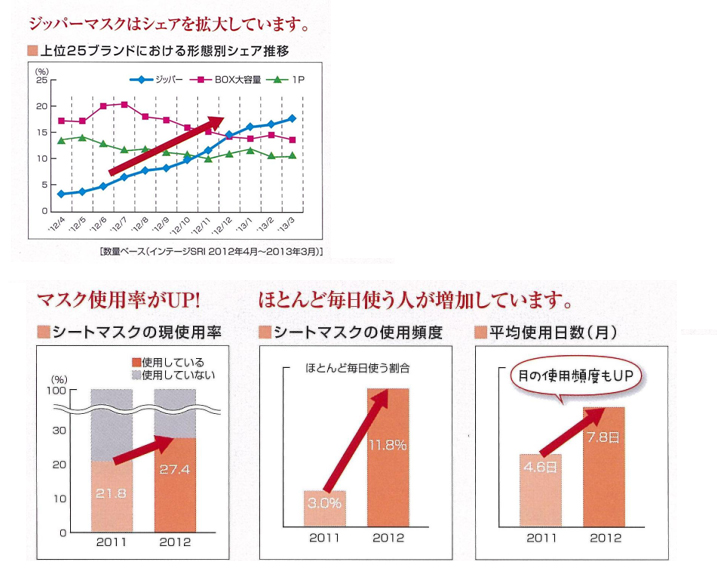 シートマスク市場は、大容量でリーズナブルなジッパータイプの商品が大きく伸張しています。同時に、シートマスクの使用率も22%から27%に増加し、使用頻度も「ほとんど毎日使用」するユーザーが3%から12%に上昇、1カ月の平均使用日数は4.6日から7.8日になっています。シートマスクの使用は、「スペシャルケア」から「デイリーケア」へと変容しています。
