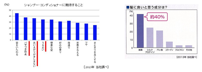 当社調査では、消費者のシャンプー、コンディショナーに期待する点は、「髪の毛をいたわる」などに加え、「うるおい」や「パサつき防止」など、洗髪後の仕上がりが重視される傾向にあります。また、「海藻は髪に良い」と広く認知されています。