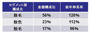 むだ毛処理剤の市場全体が拡大傾向ですが、中でも、除毛カテゴリーが前年比120%と伸長しています。