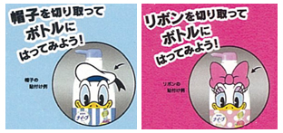 詰替用の裏面にそれぞれ付いている「ドナルド」の帽子と「デイジー」のリボンを切り取り、ボトルに貼り付けて遊べます。
