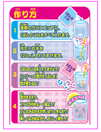 最初に、透明なガラスコップにラムネが入った「1ばんのこな」と冷たいお水でジュースを作り、次に「2ばんのこな」を入れると、色が変わり、シュワーッとソーダになって、コップの底に沈んでいたラムネがプカプカ踊りだします。