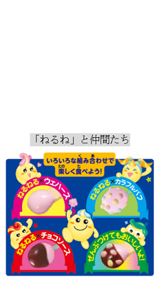 3)新たにパッケージに登場した「ねるね」の仲間たちが、おいしい食べ方を、パッケージの裏面で紹介しています。