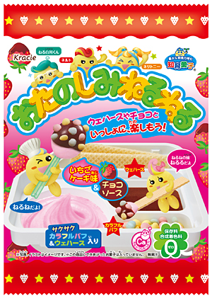 トレーに「1ばんのこな」と水を入れて練り、次に「2ばんのこな」を加えてよく練ると、色が変わってふくらみ、“ふわふわ”な「いちごケーキ味」の「ねるねるねるね」の出来上がり。ウエハース、チョコソース、カラフルパフを好きなように組み合わせれば、いろいろな食べ方が楽しめます。